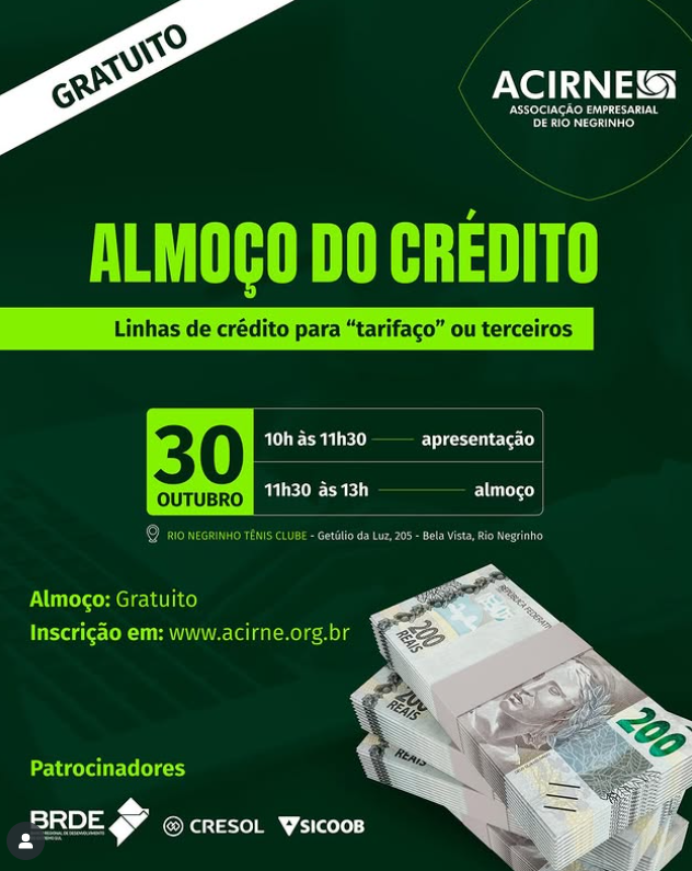 A ACIRNE – Associação Empresarial de Rio Negrinho realiza, no dia 30 de outubro (quinta-feira), às 10h, no Tênis Club, o Almoço de Crédito, um evento voltado a empresários e representantes de cooperativas da região que desejam conhecer novas linhas de financiamento, oportunidades de crédito e soluções para expandir seus negócios.