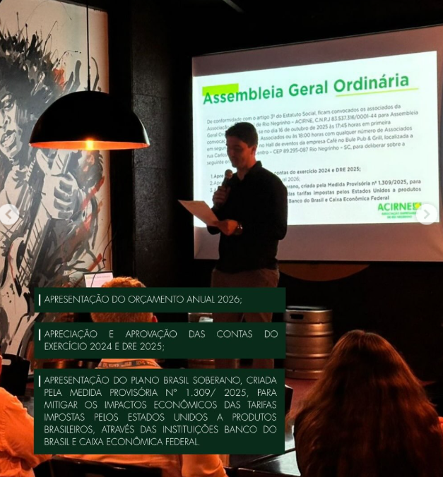 No dia 16 de outubro, a ACIRNE – Associação Empresarial de Rio Negrinho realizou sua Assembleia Geral Ordinária, um dos momentos mais importantes do calendário institucional da entidade.