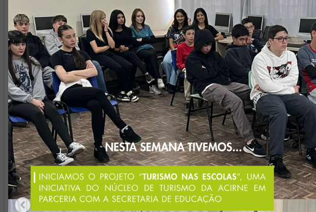 O NĂșcleo de Turismo da ACIRNE, em parceria com a Secretaria de Educação, deu inĂ­cio ao Projeto Turismo nas Escolas. A iniciativa busca aproximar os alunos da realidade do setor turĂ­stico, despertando o interesse pelas potencialidades de Rio Negrinho e promovendo a valorização da cultura e dos atrativos locais.